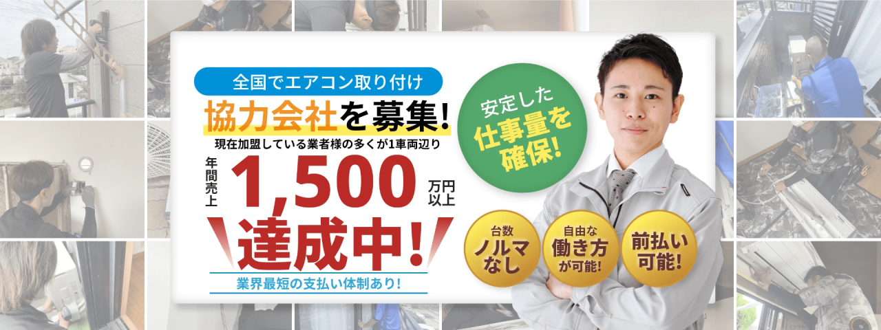 弊社は家電量販店様、不動産管理会社様、建築会社様、工務店様、通販会社様、総合商社様などのエアコン工事や電気工事を請負っており、この度は事業及びエリア拡大に伴いまして協力して頂けるエアコン工事業者様を募集しております。